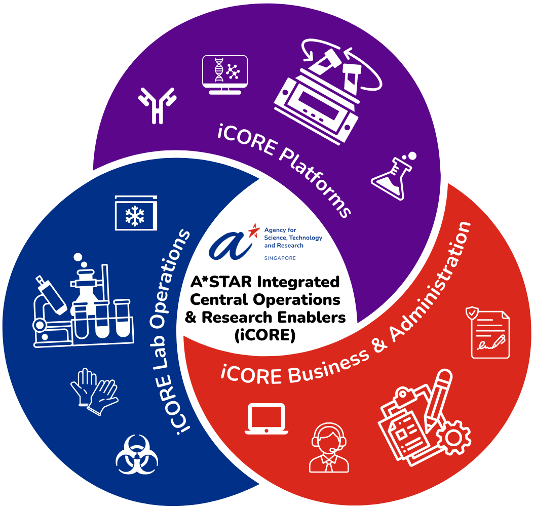 A*STAR Integrated Central Operations & Research Enablers (iCORE) plays a vital strategic role in strengthening the biomedical research ecosystem by delivering reliable, efficient, and future-ready scientific and operational support. By integrating deep expertise, research infrastructure, and optimised operations, iCORE ensures that researchers across A*STAR, academia, and industry can focus on scientific innovation whilst relying on critical support functions operating seamlessly in the background. iCORE is built on three major pillars: iCORE Platforms, Laboratory Operations, and the Office of iCORE, integrated to provide both front-end scientific capabilities and back-end operational excellence. Together, these functions enable end-to-end support elevating research quality and efficiency across the ecosystem.