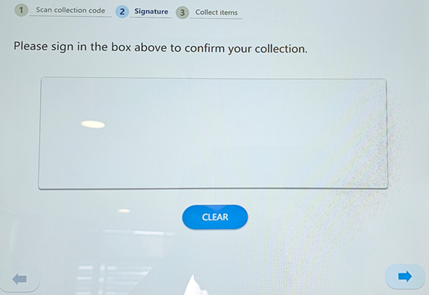 - Login via email address: Enter the email address used when placing orders. Enter the “Collection Code”. Write your name, press enter and collect the items. Close the door securely after collection to prevent any penalty fees.