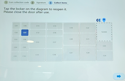 Once the order is retrieved, ensure to securely close the locker door to avoid penalty fees. Click on the arrow at the bottom right corner of the screen to proceed.