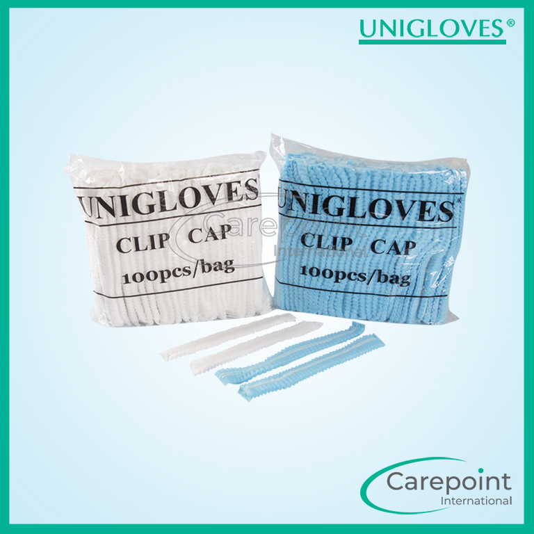 UNIGLOVES Disposable Clip Cap Blue. Packing: 100pcs /bag. Non-woven Material. Light, soft and comfortoble to wear.